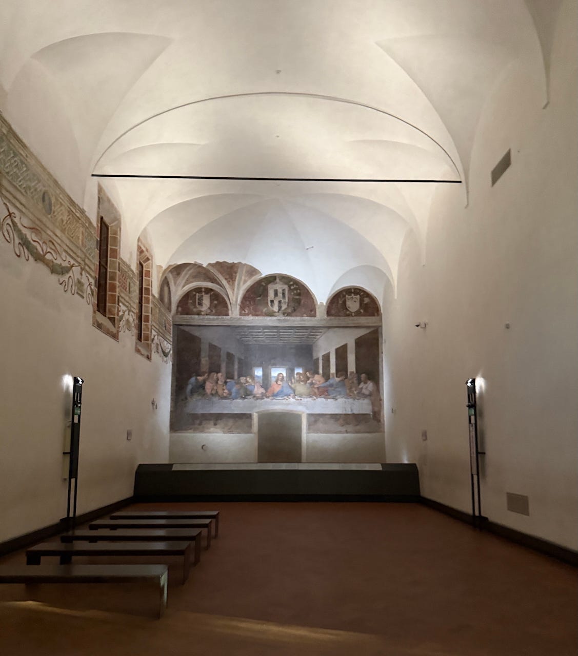 Then the room itself takes over. The refectory is long, narrow, dimly lit. It feels almost stripped down so that nothing competes with the wall ahead. The quiet, the scale, and the distance all prepare your eyes for something your memory of reproductions can’t match.